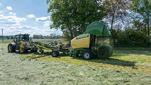 The Krone Swadro BaleTrain TC 880 Pro is a groundbreaking forage machine that combines swathing and baling in one seamless operation. This configuration integrates a modified Swadro TC 880 twin-rotor rake with a Krone round baler, enabling a single operator to perform both tasks in a streamlined process—a first in the industry.
