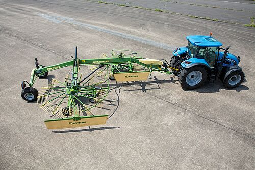 The Krone Swadro TS 740 Twin is ideal for farmers seeking a versatile and efficient rotary rake that can handle varying forage conditions and provide flexibility in swath formation. Its robust design and adjustable features make it a valuable asset for enhancing productivity in forage harvesting operations.